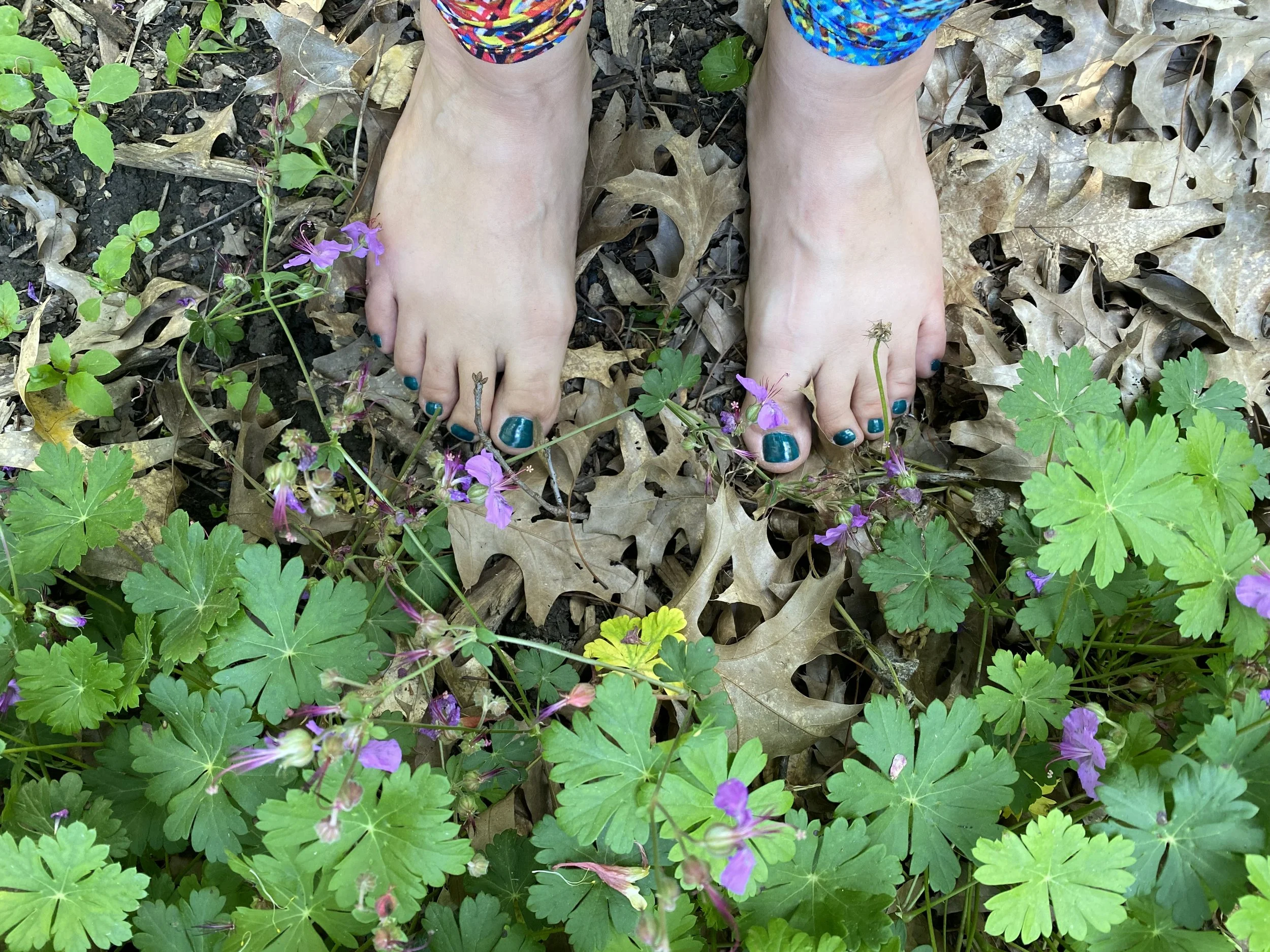 /a view from above of bare feet with teal nail polish standing on a ground amidst oak leaves. in front of the feet are small geraniums.